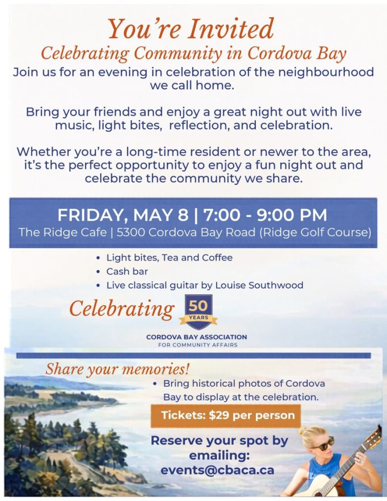 Celebrate 50 years of the Cordova Bay Association for Community Affairs with an evening of connection and reflection. Enjoy live classical guitar, light refreshments, and a chance to share memories with fellow community members.